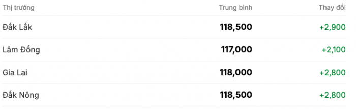 Cụ thể, Đắk Lắk ghi nhận mức tăng cao nhất là 2.900 đồng/kg, đưa giá lên 118.500 đồng/kg; Đắk Nông cũng tiến sát ngưỡng này với 118.500 đồng/kg sau khi tăng 2.800 đồng/kg. Gia Lai nhích lên 118.000 đồng/kg, còn Lâm Đồng, khu vực có sản lượng ổn định hiện đạt 117.000 đồng/kg, tăng 2.100 đồng/kg so với hôm qua.