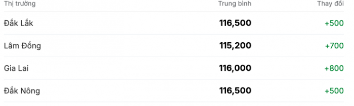 Cụ thể, tại Đắk Lắk và Đắk Nông, giá cà phê đồng loạt tăng 900 đồng/kg, đạt mức cao nhất 116.500 đồng/kg. Tại Gia Lai, giá tăng 800 đồng/kg lên 116.000 đồng/kg, trong khi Lâm Đồng tăng 700 đồng/kg, giao dịch quanh 115.200 đồng/kg. Một số đại lý cho biết, lượng hàng giao dịch những ngày gần đây tăng nhẹ do nhiều doanh nghiệp đẩy mạnh thu mua chuẩn bị cho các hợp đồng xuất khẩu cuối năm.