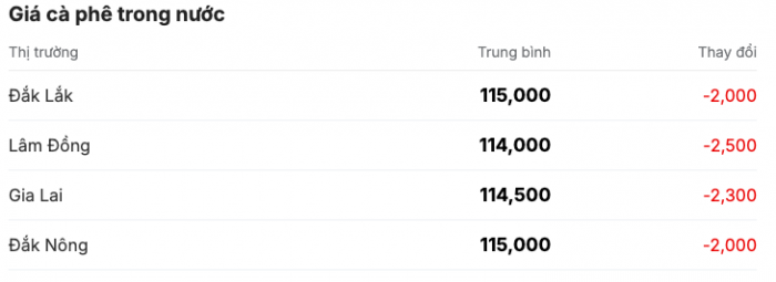 Lâm Đồng giảm mạnh nhất, mất 2.500 đồng/kg, còn 114.000 đồng/kg; Đắk Lắk và Đắk Nông đồng loạt giảm 2.000 đồng/kg, chốt 115.000 đồng/kg; Gia Lai giảm 2.300 đồng/kg, còn 114.500 đồng/kg.