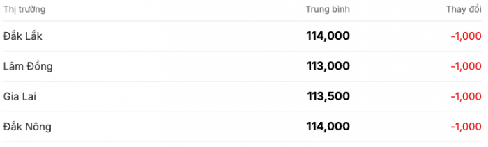 Tại các tỉnh Tây Nguyên – vùng trọng điểm cà phê của cả nước cho thấy giá cà phê sáng nay giảm thêm 1.000 đồng/kg, đưa mức trung bình toàn vùng xuống còn 113.800 đồng/kg.