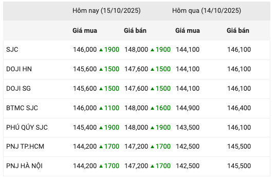 Giá vàng trong nước ngày 15/10 tiếp tục leo thẳng đứng, phá vỡ mọi kỷ lục từng có trong lịch sử. Tính đến 15 giờ chiều nay, giá vàng miếng SJC tại hàng loạt doanh nghiệp lớn đã vượt mốc 148 triệu đồng/lượng, khiến giới đầu tư 'choáng váng'.
