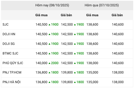Cụ thể, giá vàng miếng SJC hiện đang được Tập đoàn DOJI niêm yết ở ngưỡng 140,5-142,5 triệu đồng/lượng (mua vào - bán ra), tăng 1,9 triệu đồng/lượng cả hai chiều mua vào và bán ra so với phiên giao dịch sáng nay. Chênh lệch giá mua vào - bán ra ở ngưỡng 2 triệu đồng/lượng.