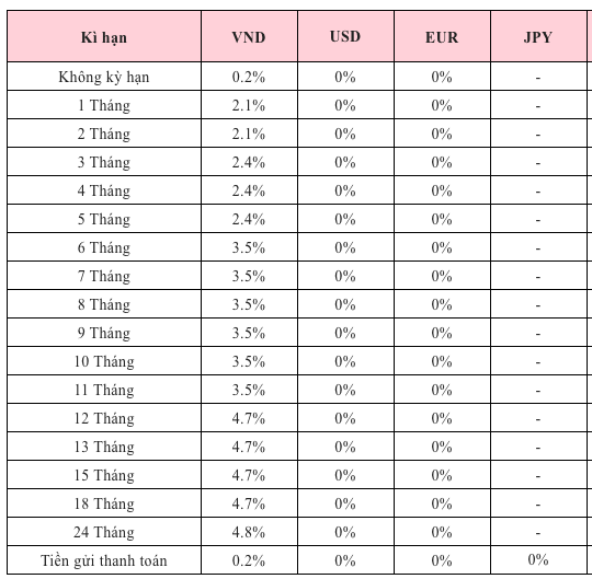 PVcomBank dẫn đầu với mức 9%/năm cho kỳ hạn 12-13 tháng, yêu cầu số dư tối thiểu 2.000 tỉ đồng. HDBank đưa ra mức 8,1%/năm cho kỳ hạn 13 tháng, với điều kiện số dư tối thiểu 500 tỉ đồng. Vikki Bank trả 7,5%/năm cho kỳ hạn từ 13 tháng trở lên, tối thiểu 999 tỉ đồng. Bac A Bank và IVB áp dụng mức 6,15 - 6,2%/năm cho khách hàng gửi từ 1 - 1.500 tỉ đồng. ACB niêm yết 6% cho kỳ hạn 13 tháng nếu khách hàng có số dư từ 200 tỉ đồng. LPBank trả tới 6,5%/năm cho kỳ hạn 13 tháng, khi gửi tối thiểu 300 tỉ đồng.