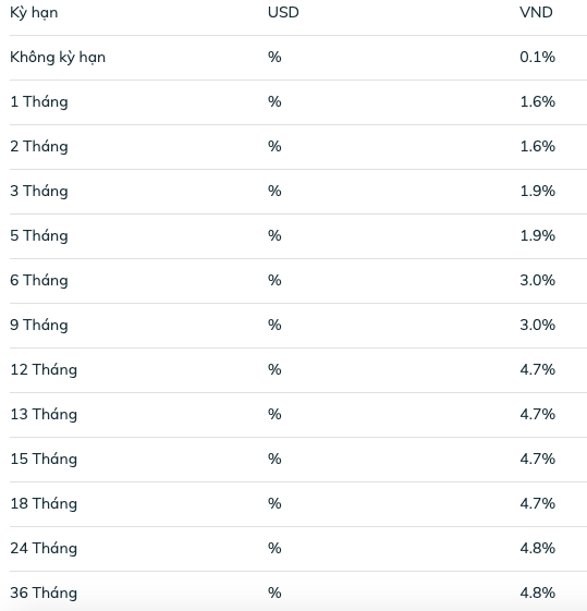 Cụ thể, ngân hàng Vikki Bank áp dụng 6,1% cho kỳ hạn 12 và 13 tháng. Ngân hàng Cake by VPBank công bố lãi 6%/năm cho kỳ hạn 12-36 tháng. HDBank duy trì 6% cho kỳ hạn 18 tháng, BVBank trả 6,1% cho kỳ hạn 60 tháng. Viet A Bank niêm yết 6% cho kỳ hạn 36 tháng, trong khi Bac A Bank áp dụng 6% cho kỳ hạn 18-36 tháng.