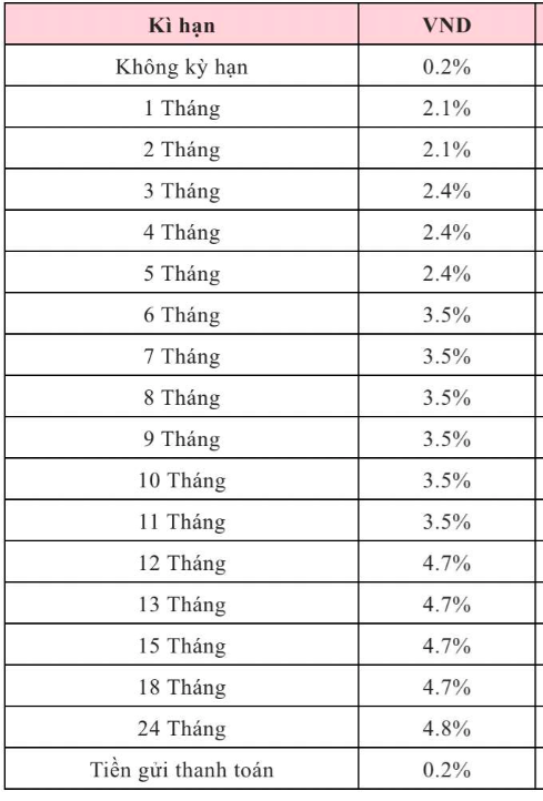 Cụ thể, kỳ hạn 12 tháng hiện được Agribank niêm yết ở mức 4,7%/năm, trong khi kỳ hạn 24 tháng đạt mức cao nhất là 4,8%/năm. Ở các kỳ hạn ngắn, mức lãi suất thấp hơn đáng kể: kỳ hạn 1 - 2 tháng là 2,1%/năm, kỳ hạn 3 - 5 tháng là 2,4%/năm, còn kỳ hạn 6 - 11 tháng dao động quanh 3,5%/năm.
