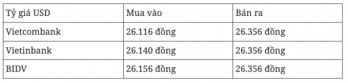 Cụ thể, Vietcombank niêm yết giá mua và bán lần lượt ở mức 26.116 - 26.356 đồng/USD; BIDV giao dịch tại 26.156 - 26.356 đồng/USD; VietinBank nâng nhẹ giá mua lên 25.980 đồng/USD, giá bán giữ nguyên ở 26.356 đồng/USD. Agribank cũng giữ biên độ tương tự ở mức 26.175 - 26.356 đồng/USD.