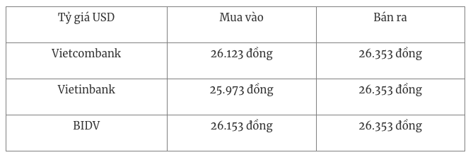 Vietcombank niêm yết 26.123 - 26.353 đồng/USD, tăng 7 đồng chiều mua và giảm 3 đồng chiều bán.
