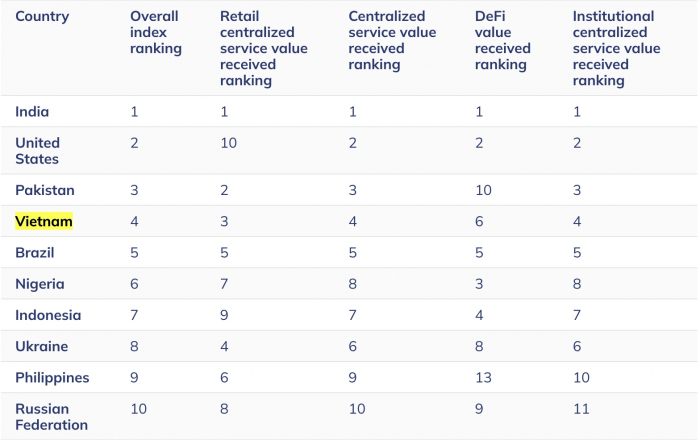 Việt Nam ghi điểm cao trên bảng xếp hạng nhờ lượng người dùng cá nhân đông đảo, đặc biệt trong cộng đồng freelancer. Theo Hiệp hội Blockchain Việt Nam, khoảng 17 triệu người Việt đang sở hữu tài sản tiền điện tử, với hơn 85% freelancer sử dụng tiền điện tử cho thanh toán, tiết kiệm hoặc đầu tư. Nhiều người trong số này thường xuyên theo dõi giá tiền số, ví dụ như Bitcoin và DOGE, để quyết định khi nào nên mua, bán hoặc điều chỉnh danh mục đầu tư của mình.