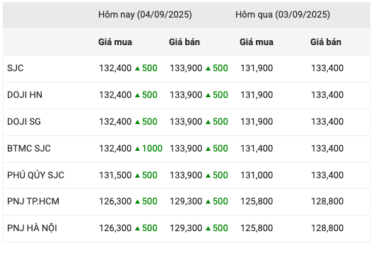 Theo khảo sát, Tập đoàn DOJI niêm yết giá vàng miếng SJC ở ngưỡng 132,4 – 133,9 triệu đồng/lượng (mua vào – bán ra), tăng 500.000 đồng/lượng cả hai chiều, chênh lệch giá mua – bán 1,5 triệu đồng/lượng.