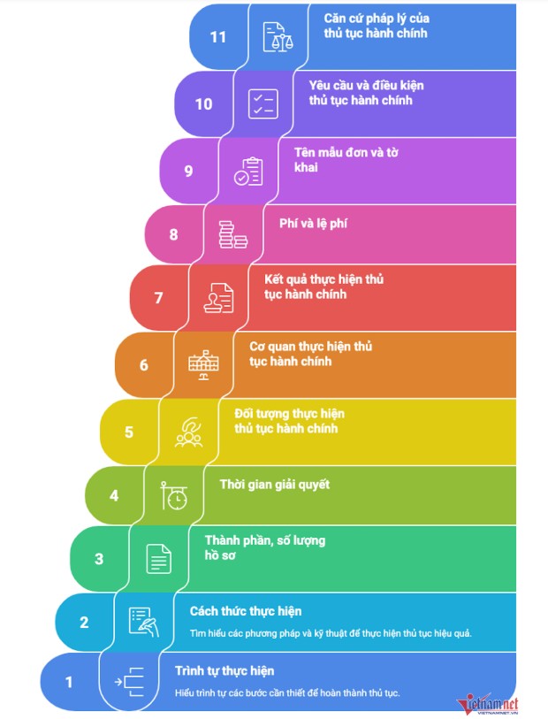 Theo đó, đã quy định về từng thủ tục đất đai cụ thể, gồm các bước: (1) Trình tự thực hiện; (2) Cách thức thực hiện; (3) Thành phần, số lượng hồ sơ; (4) Thời gian giải quyết; (5) Đối tượng thực hiện thủ tục hành chính; (6) Cơ quan thực hiện thủ tục hành chính; (7) Kết quả thực hiện thủ tục hành chính; (8) Phí, lệ phí; (9) Tên mẫu đơn, tờ khai; (10) Yêu cầu, điều kiện thực hiện thủ tục hành chính (nếu có); (11) Căn cứ pháp lý của thủ tục hành chính. Hà Nội triển khai chiến dịch "90 ngày làm sạch dữ liệu đất đai" - một trong những nhiệm vụ trọng tâm nhằm chuẩn hóa, đồng bộ và kết nối dữ liệu đất đai với dữ liệu dân cư.
