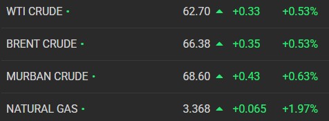 Giá dầu WTI ở mốc 62,70 USD/thùng, tăng 0,53% (tương đương tăng 0,33 USD/thùng). Tương tự, giá dầu Brent ở mốc 66,38 USD/thùng, tăng 0,53% (tương đương tăng 0,35 USD/thùng).