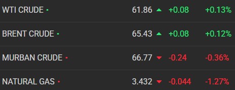 Giá dầu WTI ở mốc 61,86 USD/thùng, tăng 0,13% (tương đương tăng 0,33 USD/thùng). Tương tự, giá dầu Brent ở mốc 65,43 USD/thùng, tăng 0,12% (tương đương tăng 0,08 USD/thùng).