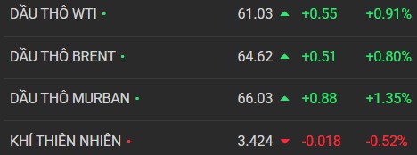 Giá dầu WTI ở mốc 61,03 USD/thùng, tăng 0,91% (tương đương tăng 0,55 USD/thùng). Tương tự, giá dầu Brent ở mốc 64,62 USD/thùng, tăng 0,80% (tương đương tăng 0,51 USD/thùng).