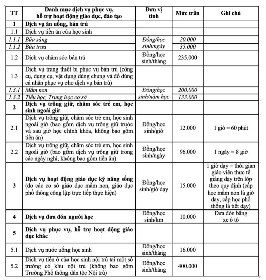 Đối với các khoản như tiền chăm sóc bán trú là 235.000 đồng/tháng; tiền trang thiết bị phục vụ bán trú cấp tiểu học, THCS là 133.000 đồng/tháng, tiền nước uống là 16.000 đồng/tháng, tiền xe ô tô đưa đón học sinh là 10.000 đồng/km… sẽ được giữ nguyên mức trần.