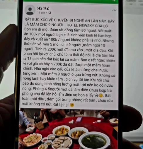 Đã xác minh thông tin về bài đăng nhóm sinh viên ở Ninh Bình bị khách sạn ở Cửa Lò chặt chém cơm đắt đỏ, không có nước nóng, phòng ốc bẩn thỉu.