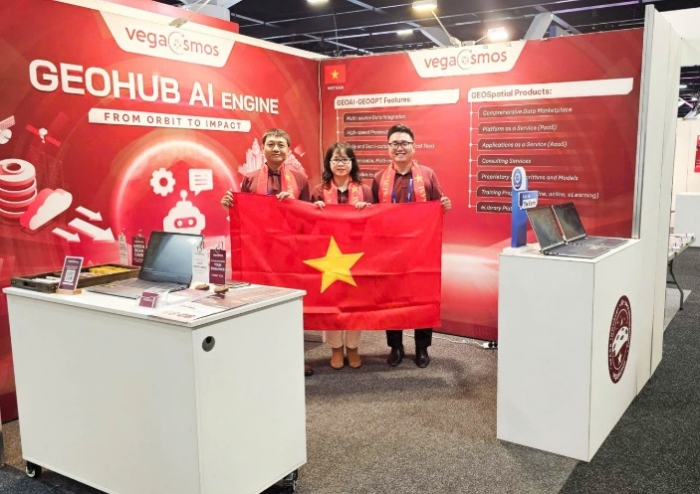 Năm nay, lần đầu tiên sản phẩm công nghệ lõi "GEOHUB AI Engine", phát triển bởi các chuyên gia công nghệ uy tín của Việt Nam thuộc công ty VEGACOSMOS được trưng bày và trình diễn. Đây là hệ thống nền tảng địa không gian thông minh, tích hợp trí tuệ nhân tạo (AI), cung cấp các công cụ phân tích dữ liệu tiên tiến và báo cáo theo thời gian thực, hỗ trợ ra quyết định chính xác, kịp thời.