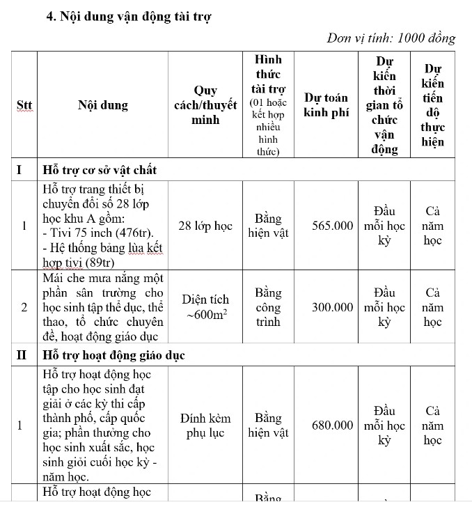 "Đây là vận động tài trợ, nhà trường không quy bình quân. Chủ trương của nhà trường là vận động phụ huynh học sinh, các nhà tài trợ, các doanh nghiệp, các mạnh thường quân có ít tài trợ ít, có nhiều tài trợ nhiều và có hạch toán đầy đủ với quan điểm công khai, minh bạch. Đây là khoản tài trợ mà đối tượng thụ hưởng là học sinh, nhà trường không cào bằng. Hiện nay, nhà trường cũng không có thông báo nào yêu cầu phụ huynh học sinh phải đóng khoản này. Sau khi Sở GD-ĐT duyệt, trường mới có thư ngỏ đến các nhà tài trợ, doanh nghiệp, mạnh thường quân để vận động", ông Quý nói. Song song với đó, lãnh đạo nhà trường sẵn sàng lắng nghe ý kiến và giải thích cụ thể để phụ huynh hiểu chủ trương cũng như quan điểm thực hiện kế hoạch vận động của nhà trường.