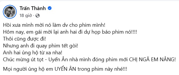 Đây cũng là lần hiếm hoi Trấn Thành không thể trực tiếp xuất hiện trong một sự kiện quan trọng của Uyển Ân. Tuy nhiên, anh vẫn không quên gửi gắm lời động viên ngọt ngào, khích lệ em gái tiếp tục tự tin chinh phục điện ảnh. Lời nhắn nhủ ngắn gọn nhưng vẫn thể hiện tình cảm gắn bó khăng khít của gia đình Trấn Thành.