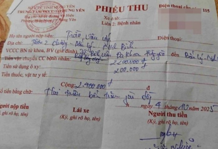 Sau khi về tới nhà, lái xe thông báo anh phải trả 2,4 triệu đồng cho phí chuyến đi. Mặc dù thấy giá hơi cao, nhưng trong lúc nhà đang có việc nên anh Ứng cũng trả tiền và yêu cầu ghi lại phiếu thu.
