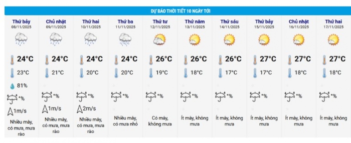 Đáng chú ý, thời tiết Hà Nội những ngày tới có mưa liên tiếp đến ngày 11/11, với mức nhiệt cao nhất khoảng 24 độ và thấp nhất 20-21 độ. Sau đó, đợt không khí lạnh mới tràn về, khiến khu vực có nắng, cao nhất 26-27 độ, nhưng rét về đêm và sáng với mức nhiệt thấp chỉ 17-18 độ.