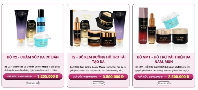 Các sản phẩm được bán theo dạng combo giá lên đến hàng triệu đồng. Ví dụ như bộ kem dưỡng Doctor Magic hỗ trợ sẹo rỗ giá 3 triệu đồng; bộ kem dưỡng Doctor Magic hỗ trợ tái tạo da giá 3,85 triệu đồng; bộ kem dưỡng hỗ trợ cải thiện da nám, tàn nhang, đồi mồi Doctor Magic giá 2,55 triệu đồng...