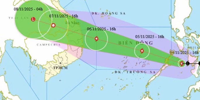 Theo ông Mai Văn Khiêm - Giám đốc Trung tâm Dự báo Khí tượng thủy văn quốc gia, dự báo đêm 4/11 rạng ngày 5/11, bão Kalmaegi vượt qua phía Bắc của đảo Palawan (Philippines) đi vào Biển Đông. Diễn biến này khiến Kalmaegi trở thành cơn bão số 13, cường độ bão có thể đạt cường độ trên cấp 14 khi ở đặc khu Trường Sa và trên vùng biển Đà Nẵng - Khánh Hòa.