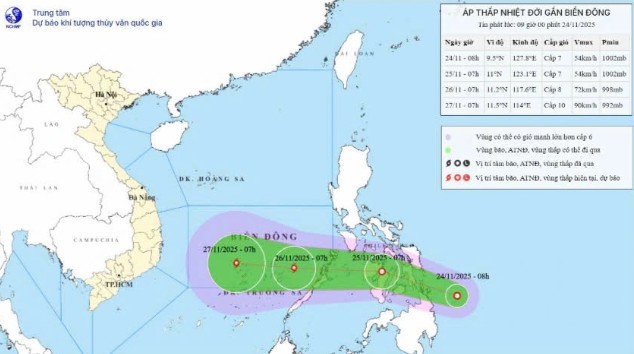 Theo Trung tâm Dự báo Khí tượng Thủy văn Quốc gia, lúc 8 giờ sáng 24/11, vùng áp thấp nhiệt đới trên khu vực phía Đông Philippines đã mạnh lên thành áp thấp nhiệt đới với tâm ở khoảng 9,5° vĩ Bắc và 128,4° kinh Đông. Trong 1 đến 2 ngày tới, hệ thống này tiếp tục di chuyển theo hướng tây tây bắc với tốc độ khoảng 20 km/giờ và dự kiến đi vào Biển Đông trong đêm 25 rạng sáng 26/11, sau đó có khả năng mạnh lên thành bão số 15.