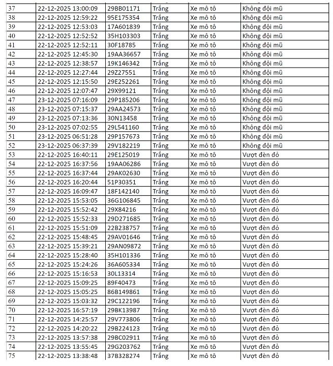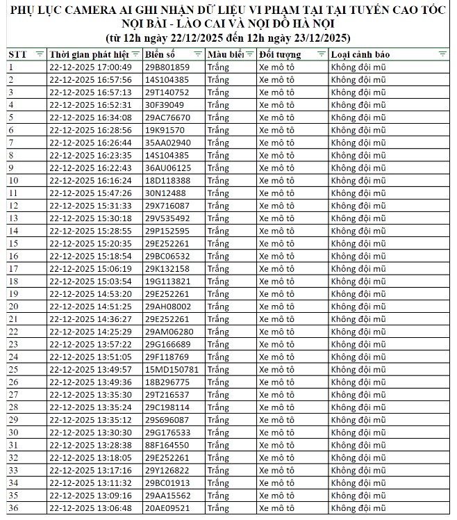 Trong vòng 24 giờ, từ 12h ngày 22/12 đến 12h ngày 23/12/2025, hệ thống camera ứng dụng trí tuệ nhân tạo (AI) tại Hà Nội và trên cao tốc Nội Bài – Lào Cai đã ghi nhận hàng loạt vi phạm giao thông, chuyển dữ liệu cho lực lượng CSGT xử lý phạt nguội theo Nghị định 168.
