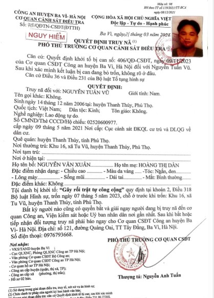 Theo thông tin từ cơ quan chức năng, trước đó, ngày 9/11/2023, Cơ quan Cảnh sát điều tra Công an huyện Ba Vì (cũ) đã khởi tố vụ án, khởi tố bị can đối với Nguyễn Tuấn Vũ về tội “Gây rối trật tự công cộng”. Trong quá trình điều tra, đối tượng đã bỏ trốn khỏi địa phương, không chấp hành yêu cầu làm việc của cơ quan chức năng. Trước tình hình trên, cơ quan điều tra đã ra quyết định truy nã với tính chất nguy hiểm đối với Vũ.