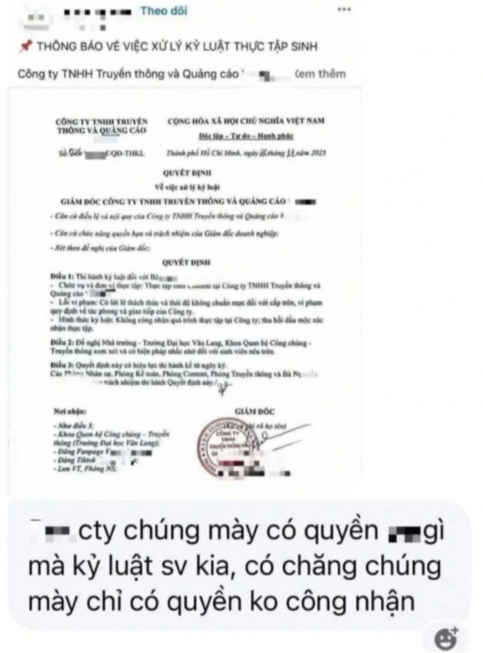 Cụ thể theo báo Dân Trí, trước đó công ty tại TP.HCM đã đăng tải lên mạng xã hội toàn bộ quyết định kỷ luật đối với nữ thực tập sinh vì cho rằng nữ sinh “có lời lẽ thách thức và thái độ không chuẩn mực với cấp trên”. Hình thức xử lý được công bố là không công nhận quá trình thực tập và thu hồi dấu xác nhận.