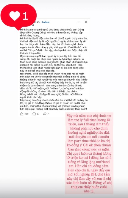 Bài đăng nhanh chóng lan rộng và tạo ra nhiều luồng ý kiến trái chiều. Dù thông tin chỉ xuất phát từ một phía, nhiều người dùng mạng xã hội liên hệ sự việc với những bài viết cũ của Hà Anh về chuyện tuyển trợ lý, điều này càng khiến tranh luận trở nên sôi nổi hơn.