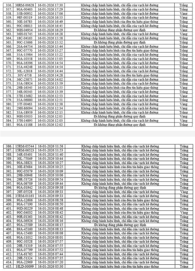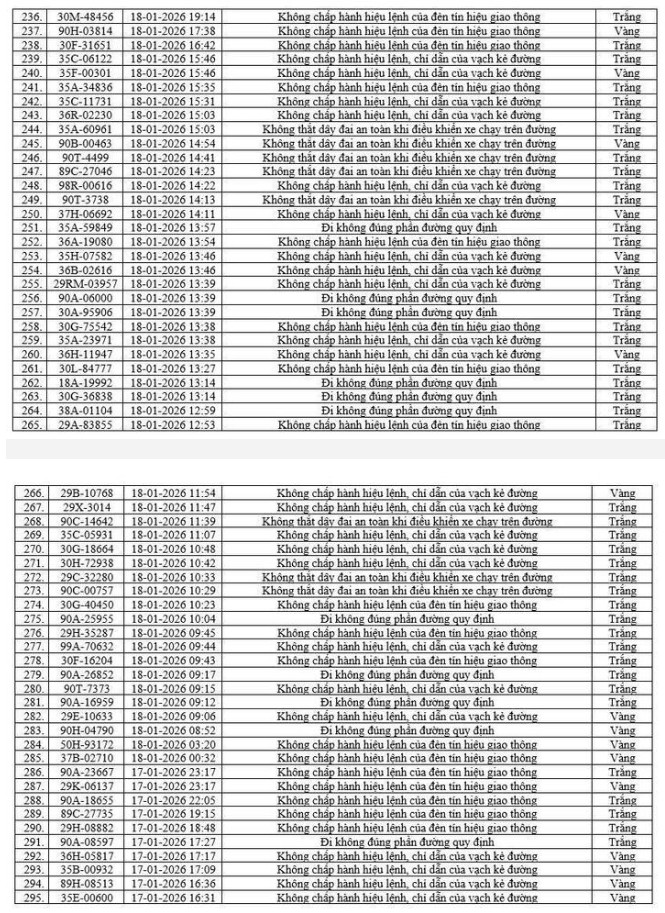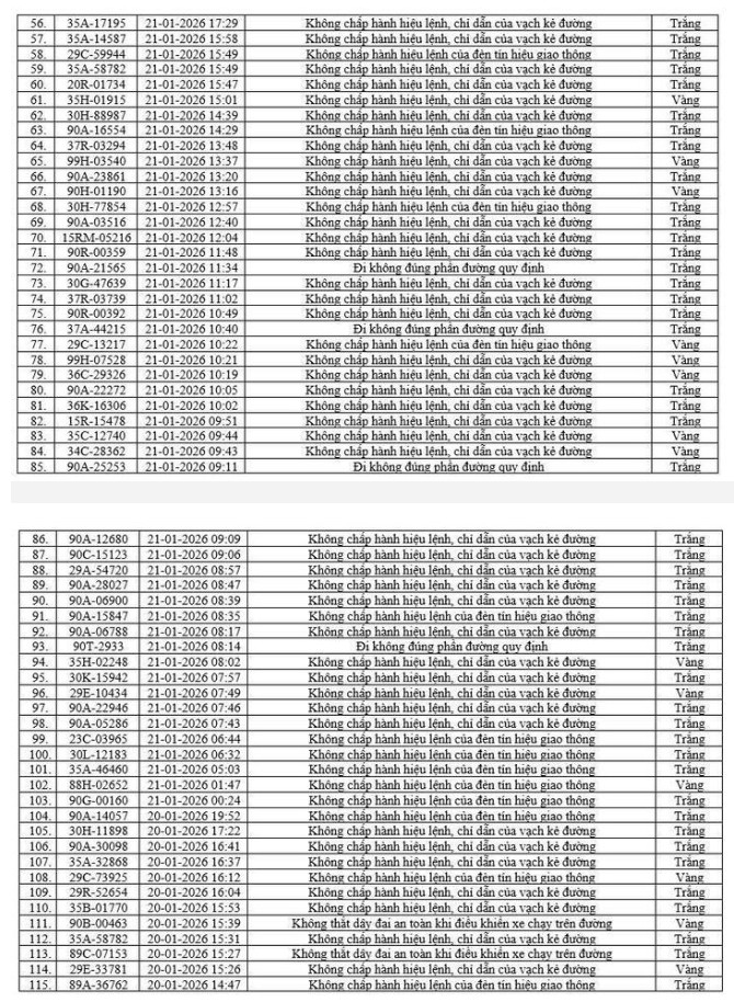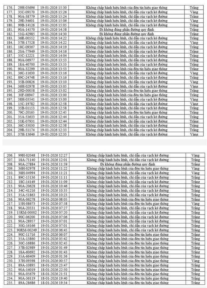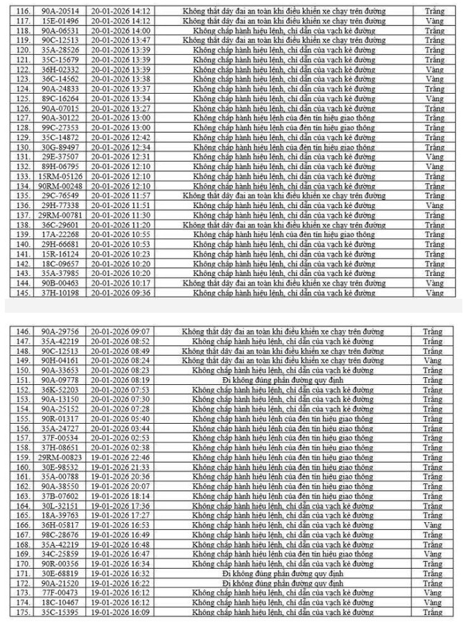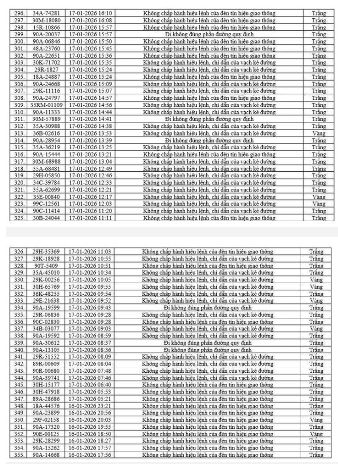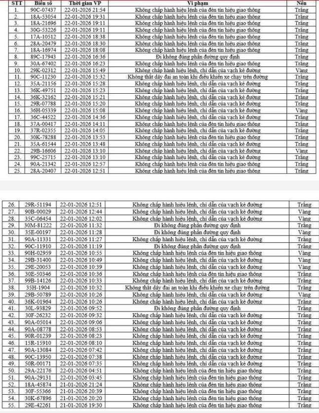 Theo Phòng Cảnh sát giao thông Công an tỉnh Ninh Bình, trong thời gian từ ngày 16 đến 22/1, hệ thống camera AI được lắp đặt trên các tuyến đường trọng điểm đã tự động ghi nhận và phân tích hình ảnh, phát hiện hàng trăm trường hợp vi phạm. Các lỗi chủ yếu gồm không chấp hành tín hiệu đèn giao thông, chạy quá tốc độ quy định, đi không đúng làn đường, phần đường và một số hành vi vi phạm khác.