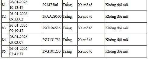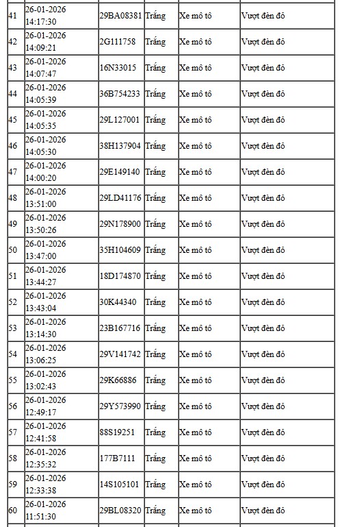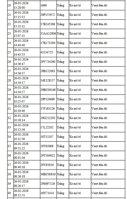 Theo dữ liệu trích xuất từ hệ thống camera AI, trong khoảng thời gian từ 12h ngày 26/1/2026 đến 12h ngày 27/1/2026, tại nút giao Phạm Văn Bạch – Hoàng Quán Chi (quận Cầu Giấy, Hà Nội), hệ thống đã phát hiện 58 trường hợp người điều khiển mô tô, xe gắn máy vượt đèn đỏ và 32 trường hợp không đội mũ bảo hiểm khi tham gia giao thông. Toàn bộ hình ảnh vi phạm đều được camera ghi nhận rõ biển số, thời gian, vị trí và hành vi vi phạm để phục vụ xử lý phạt nguội theo quy định.