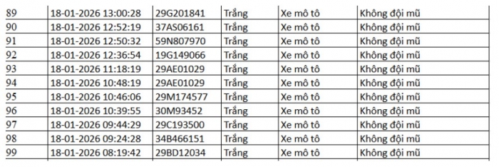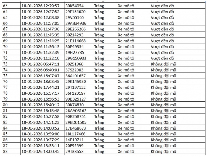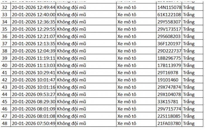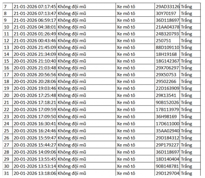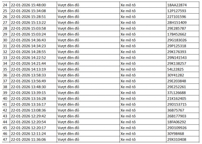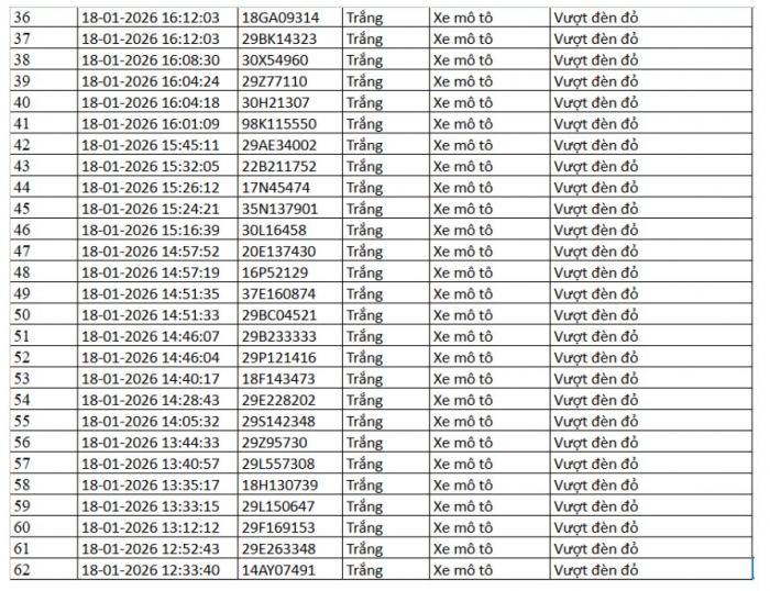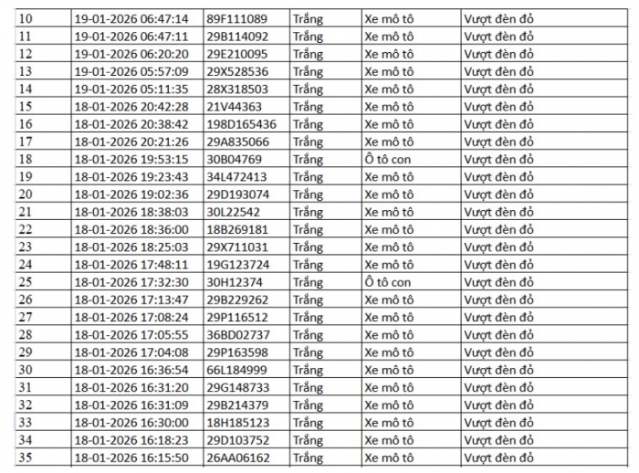 Danh sách vi phạm được trích xuất từ hệ thống camera ở Hà Nội trong các ngày từ 18/01 đến 23/01/2026 cho thấy số lượng vi phạm tập trung vào việc vượt đèn đỏ, chạy quá tốc độ quy định… Trong đó nhiều trường hợp bị ghi nhận lập biên bản mà chủ phương tiện chưa nộp phạt hành chính.