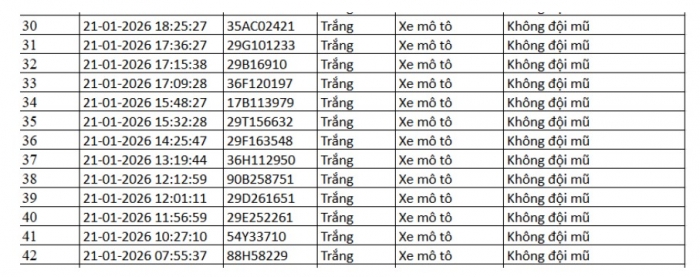 Từ 12h00’ ngày 20/1/2026 đến 12h00’ ngày 21/1/2026, đã phát hiện 42 trường hợp xe máy vi phạm.