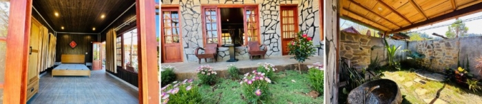 Hoàng Mập cho biết dù nhiều người góp ý xây dựng theo phong cách hiện đại, anh vẫn lựa chọn lối kiến trúc truyền thống, sử dụng gỗ, đá và vật liệu mộc nhằm tạo sự gần gũi, phù hợp cho sinh hoạt gia đình và nghỉ dưỡng lâu dài. Các phòng ngủ được bố trí như homestay để đón bạn bè, người thân đến lưu trú.