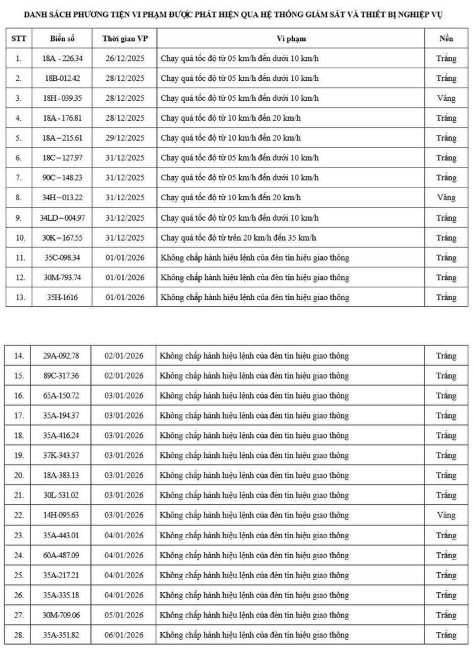 Trong 20 ngày từ 26/12/2025 đến 15/01/2026, hệ thống camera giám sát giao thông ứng dụng trí tuệ nhân tạo (AI) do Phòng Cảnh sát giao thông (CSGT) Công an tỉnh Ninh Bình vận hành đã ghi nhận 74 trường hợp vi phạm trật tự, an toàn giao thông (TTATGT) trên các tuyến trọng điểm của tỉnh. Toàn bộ các trường hợp vi phạm đã được thông báo đến chủ phương tiện để xử lý theo hình thức “phạt nguội” theo quy định của pháp luật.