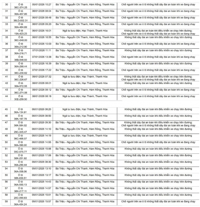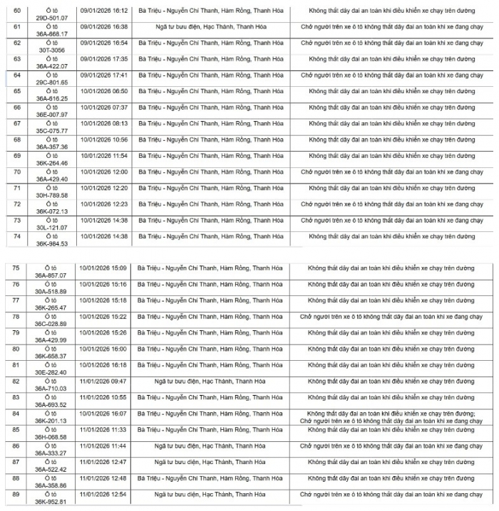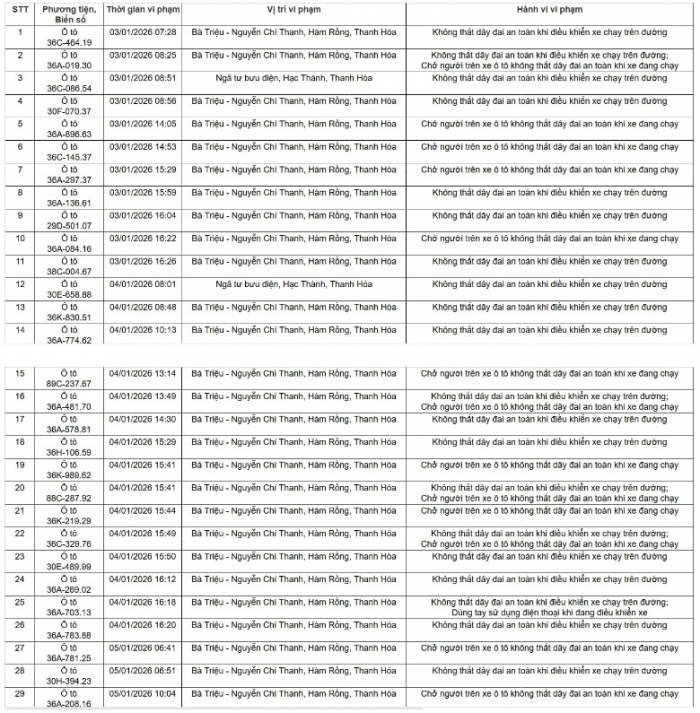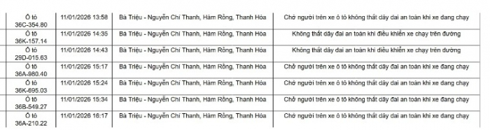 Theo cơ quan chức năng, các lỗi vi phạm được hệ thống camera ghi nhận diễn ra từ ngày 3/1 đến ngày 11/1/2026, gồm hai nhóm chính: Không thắt dây an toàn khi điều khiển và ngồi trên xe; và dùng tay cầm, sử dụng điện thoại hoặc thiết bị điện tử khi phương tiện di chuyển trên đường bộ.