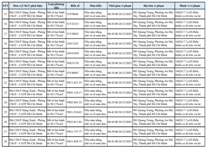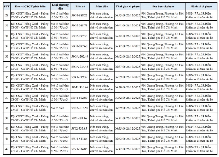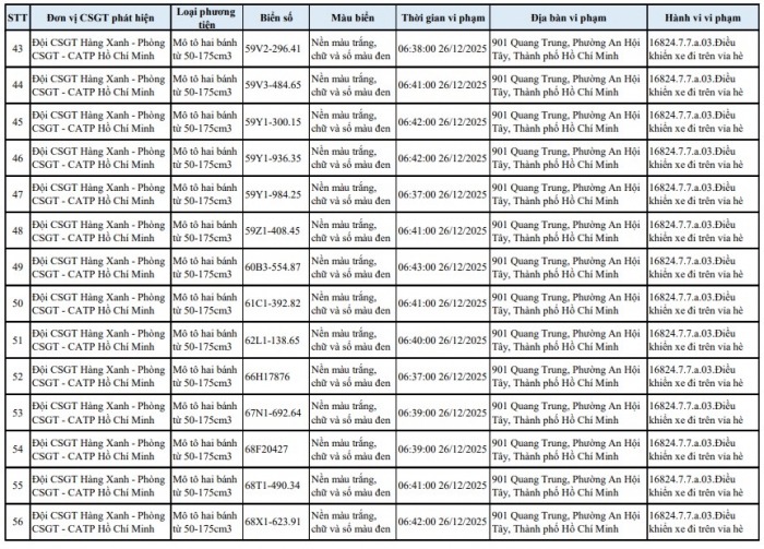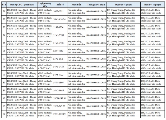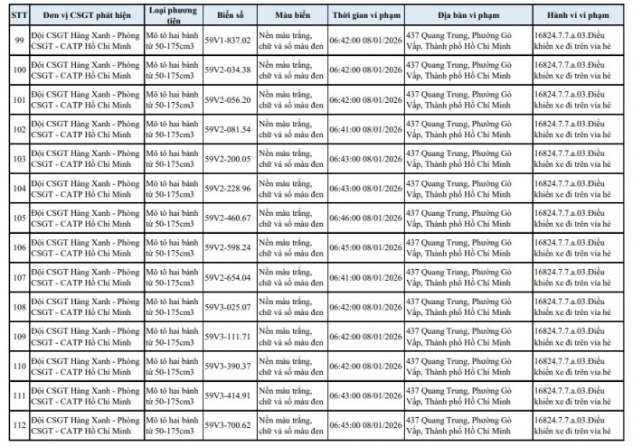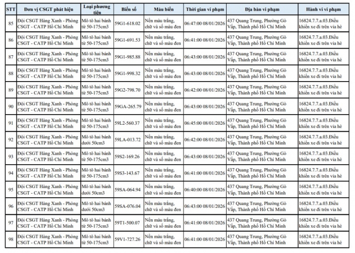 Theo Phòng CSGT TP.HCM, trong thời gian qua, tình trạng xe máy lợi dụng lúc ùn tắc để chạy lên vỉa hè trên tuyến đường Quang Trung diễn ra phổ biến, gây mất an toàn giao thông và bức xúc cho người dân. Lực lượng chức năng đã tổ chức ghi hình, xác minh và tiến hành phạt nguội 138 trường hợp vi phạm, đồng thời công khai danh sách phương tiện để chủ xe biết, chủ động phối hợp giải quyết theo quy định.
