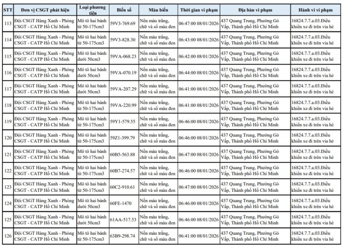 TP.HCM – Phòng Cảnh sát giao thông (CSGT) Công an TP.HCM vừa công khai danh sách 138 xe máy bị phạt nguội do vi phạm lỗi leo vỉa hè trên đường Quang Trung, đoạn qua địa bàn quận Gò Vấp và phường An Hội Tây. Việc xử lý được thực hiện thông qua hệ thống camera, ghi hình trực tiếp các hành vi vi phạm nhằm lập lại trật tự an toàn giao thông, trả lại vỉa hè cho người đi bộ.