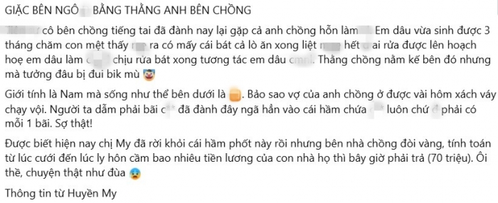 Theo diễn biến đang lan truyền, chị My sau đó đã rời khỏi nhà chồng. Song câu chuyện tiếp tục gây xôn xao khi xuất hiện thông tin gia đình chồng yêu cầu “tính toán lại” tài chính trong thời gian hôn nhân. Con số được nhắc đến là khoảng 70 triệu đồng, được cho là liên quan đến thu nhập của chị trong thời gian chung sống.