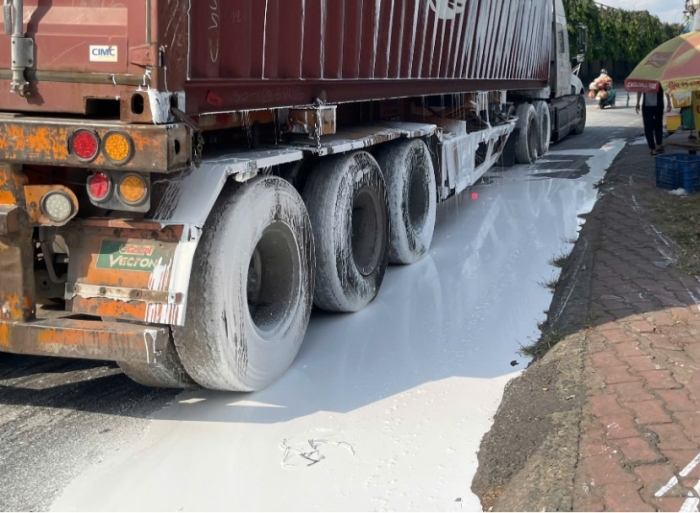 Cú lật khiến thùng container biến dạng, hàng loạt thùng sơn bên trong bung ra, đổ tràn và phủ trắng cả một mảng lớn mặt đường. Lớp sơn loang rộng không chỉ gây mất mỹ quan mà còn tạo bề mặt trơn trượt, tiềm ẩn nguy cơ tai nạn dây chuyền nếu không được xử lý kịp thời.