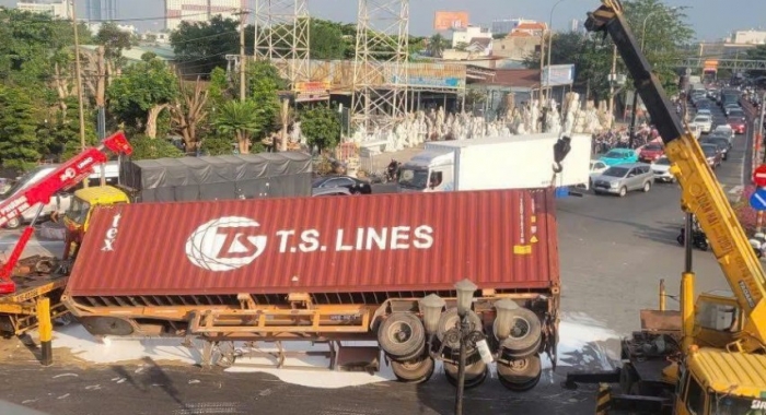 Một xe container bất ngờ lật ngang tại vòng xoay khét tiếng ở TP.HCM trong rạng sáng 27/3, khiến hàng chục thùng sơn tràn ra đường, tài xế phải đập cửa kính tự cứu mình.