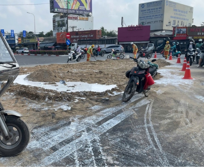 Ngay sau khi nhận tin báo, lực lượng chức năng nhanh chóng có mặt phong tỏa hiện trường, điều tiết giao thông và triển khai công tác khắc phục. Hàng chục công nhân môi trường được huy động, sử dụng cát và dụng cụ chuyên dụng để xử lý lớp sơn tràn trên mặt đường nhằm đảm bảo an toàn cho các phương tiện lưu thông qua khu vực.