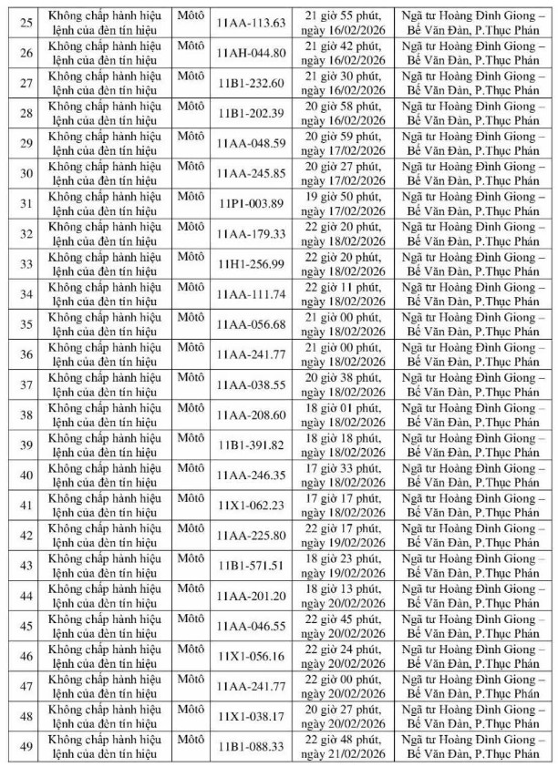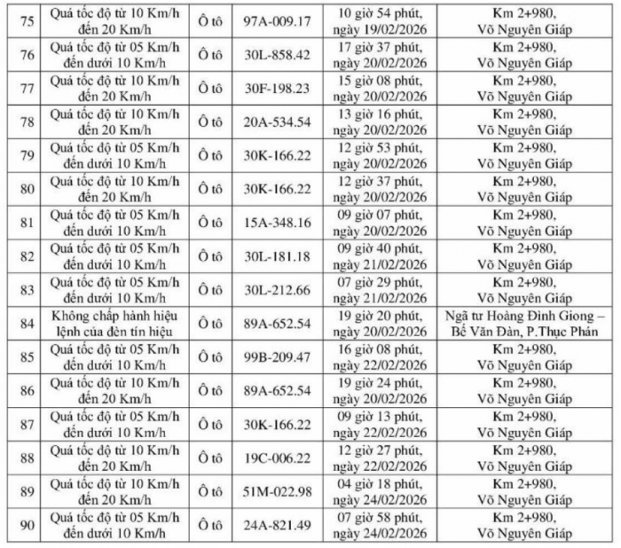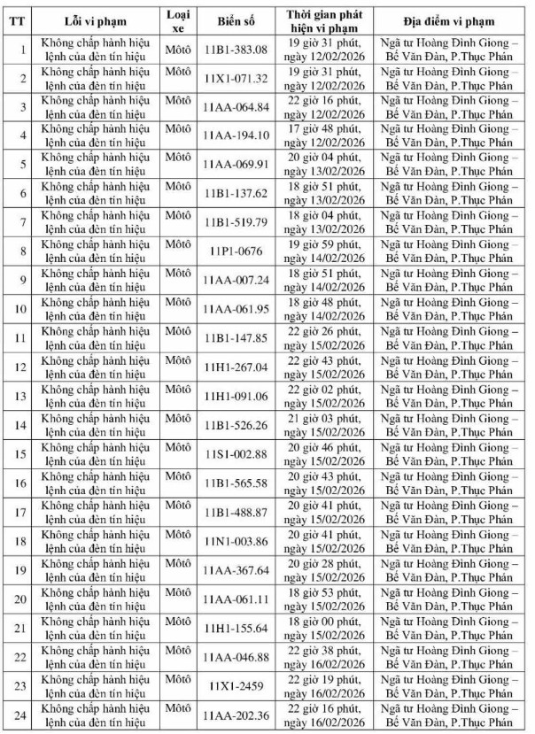 Theo thông tin từ Công an tỉnh Cao Bằng, qua hệ thống camera giám sát giao thông và công tác tuần tra, lực lượng chức năng đã ghi nhận 90 trường hợp vi phạm trong khoảng thời gian từ ngày 12/2 đến 25/2/2026. Trong số này, 65 trường hợp điều khiển xe mô tô không chấp hành hiệu lệnh đèn tín hiệu giao thông, 25 trường hợp điều khiển ô tô vi phạm tốc độ. Danh sách biển kiểm soát phương tiện đã được công bố công khai, yêu cầu chủ phương tiện nhanh chóng liên hệ cơ quan công an để giải quyết theo quy định.