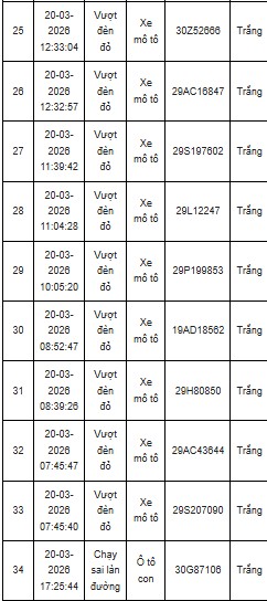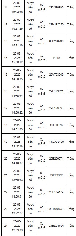 Trong khoảng thời gian từ 7h30 ngày 20/3 đến 7h30 ngày 21/3/2026, hệ thống camera giám sát giao thông đã phát hiện nhiều trường hợp vi phạm trên các tuyến đường. Theo ghi nhận, phần lớn lỗi tập trung vào hành vi vượt đèn đỏ, bên cạnh đó còn có các lỗi phổ biến như không đội mũ bảo hiểm và đi không đúng làn đường quy định. Toàn bộ dữ liệu hình ảnh, biển số xe đã được chuyển đến cơ quan chức năng để tiến hành xử lý phạt nguội theo quy định.