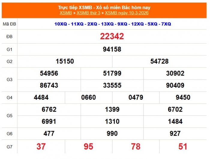 Kết quả xổ số miền Bắc ngày 10/3/2026