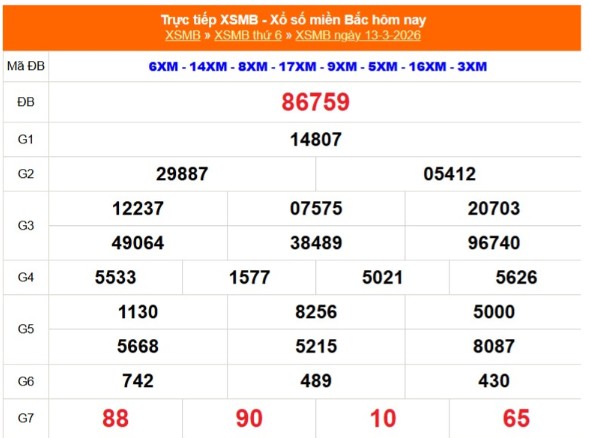 Kết quả xổ số miền Bắc ngày 13/3/2026