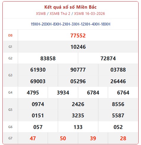 Kết quả xổ số miền Bắc (XSMB) hôm nay ngày 16/3/2026 tiếp tục được công bố vào khung giờ quen thuộc, mang đến cơ hội trúng thưởng cho hàng triệu người chơi trên cả nước.