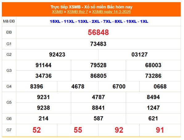 Kết quả xổ số miền Bắc ngày 14/3/2026
